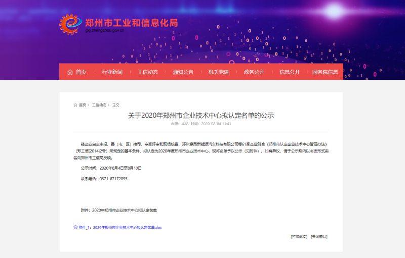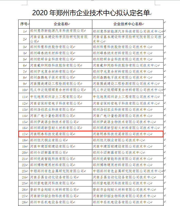 2020年8月4日,經(jīng)企業(yè)自主申報、縣(市、區(qū))推薦、專家評審和現(xiàn)場核查,河南明泰科技發(fā)展有限公司等61家企業(yè)符合《鄭州市認(rèn)定企業(yè)技術(shù)中心管理辦法》(鄭工信[2014]2號)所規(guī)定的基本條件,擬認(rèn)定為2020年度鄭州市企業(yè)技術(shù)中心,鄭州市工業(yè)和信息化局將名單予以公示。