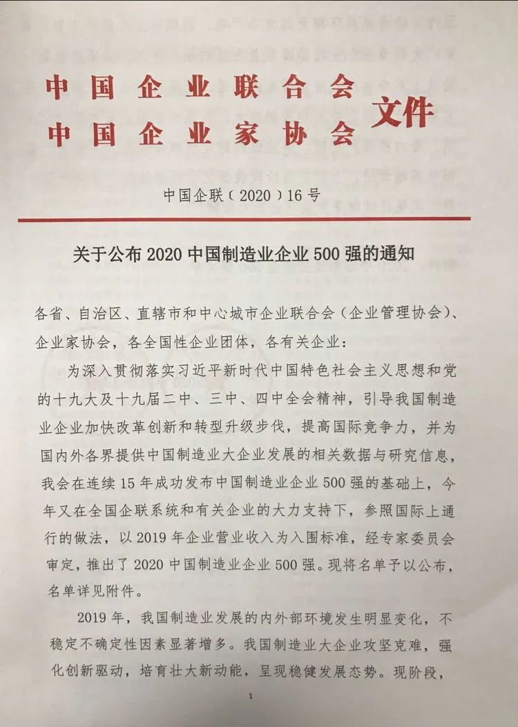 近期,中國企業聯合會、中國企業家協會公布“2020中國制造業企業500強”名單,明泰鋁業首次上榜,位列第418位。